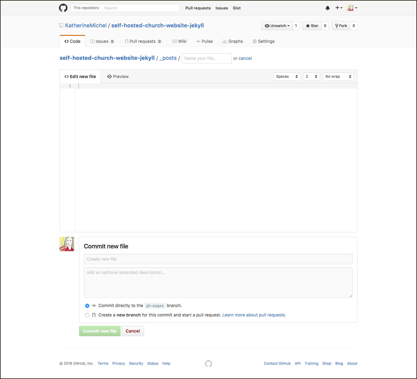 When you are happy with your post, scroll to the bottom of the page. Optionally, leave a commit message. Click the green "Commit new file" button