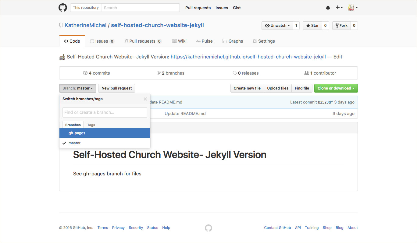 In a mission critical, live production environment, a website may be updated and viewed locally (offline, on an individual computer), before the new code is pushed to the web host and viewed on a live staging site that is virtually the same as the live production site. If the result on the staging site is satisfactory, the change may be pushed to the live site where it will be seen by users. It is assumed that a website made using the approach given in this GitBook will be simple/low traffic enough that major updates could be verified locally and pushed directly to gh-pages. Minor changes, such as adding a blog post, could be completedly directly in GitHub via the browser. However, it is possible that a staging site could be created by making a staging branch, and merging the staging branch with the gh-pages branch.